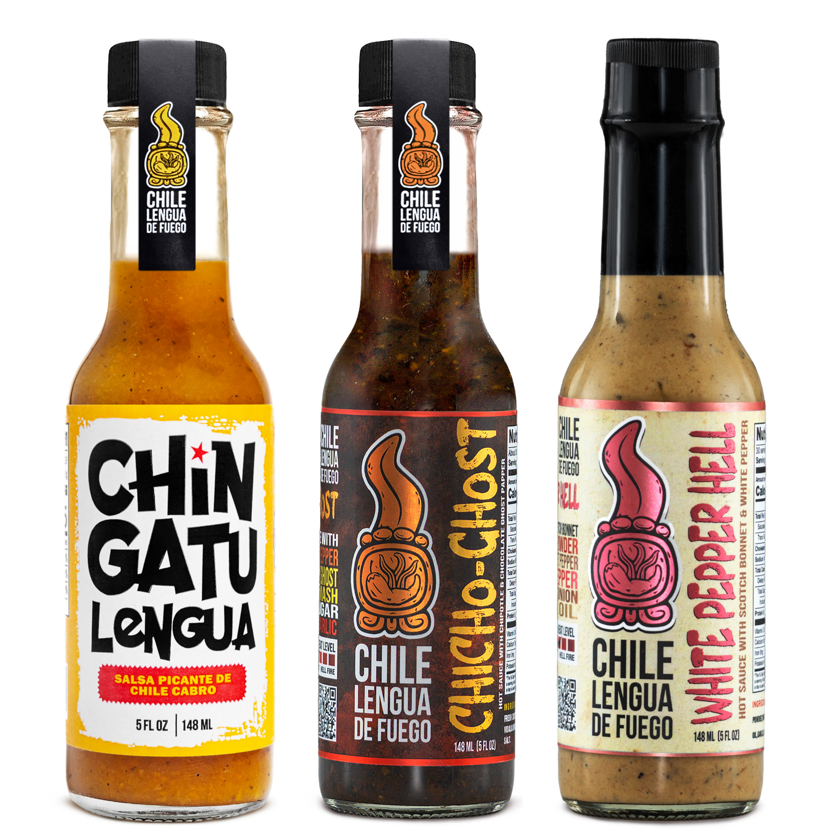 Chicho-Ghost, Anillo de Fuego, White Pepper Hell hot sauce bundle from Chile Lengua de Fuego. Explore bold flavors and curated pairings.